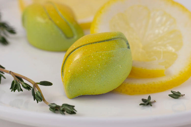 Lemon & Thyme: A white chocolate shell encases the fresh infusion of thyme and organic lemon juice. A timeless, exotic chocolate flavor.